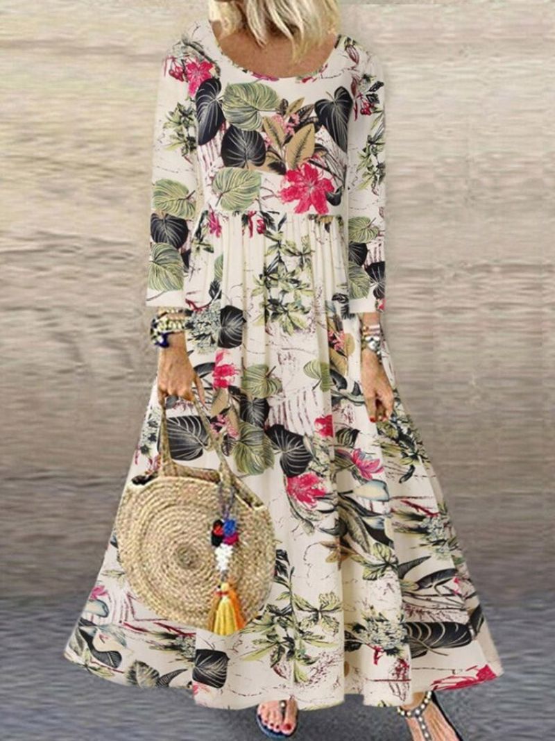Φθινοπωρινό Φόρεμα Με Στρογγυλή Λαιμόκοψη Με Εννέα Πόντους Στάμπα Με Ψηλόμεσο Μανίκι