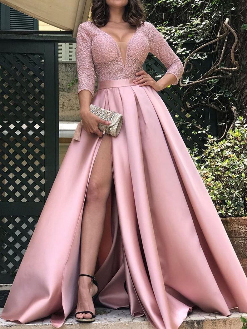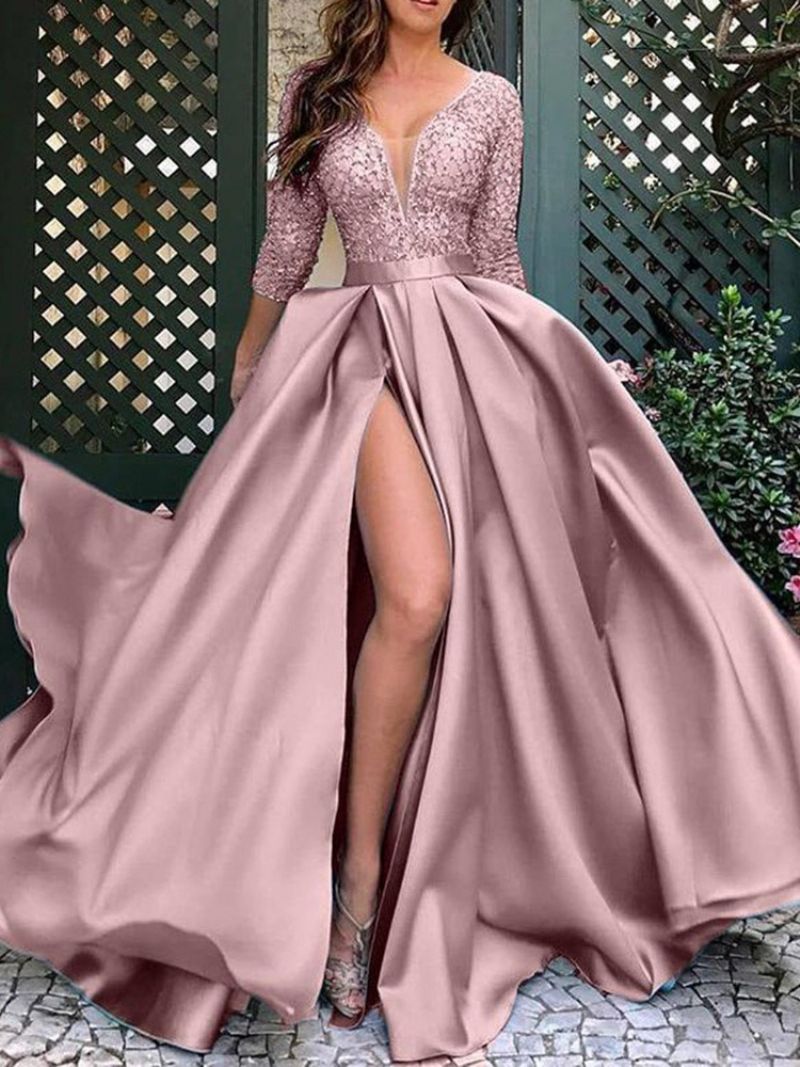 Μονόχρωμο Φόρεμα Πουλόβερ Με Μανίκια Τριών Τετάρτων Μέχρι Το Πάτωμα